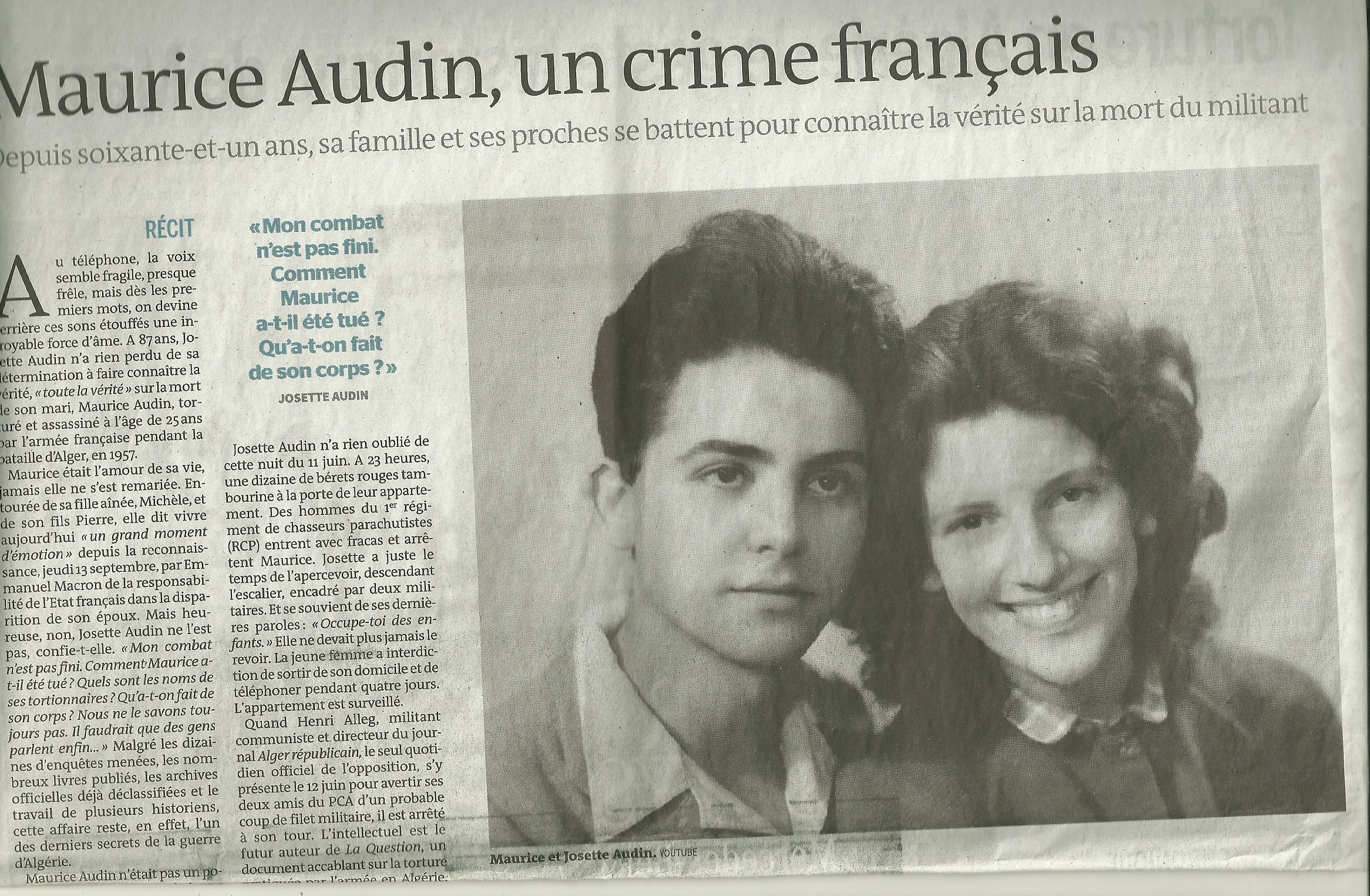Josette Audin n’a jamais renoncé, ne s’est jamais résignée ..." (Dimanche, 3 Février, 2019 - extraits de l’article de Maud Vergnol)