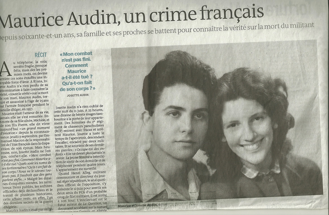 Plus de 60 ans ont passé, l’association Maurice Audin attend une déclaration du Président de la République reconnaissant non seulement la détention de Maurice Audin par l’armée mais aussi qu’il a été torturé et que son assassinat est bien un crime d’Etat.