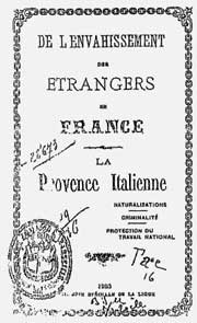 [...] Après avoir aidé les leurs à conquérir sur nous le travail qui faisait vivre les nôtres, les Italiens naturalisés français marchent dès maintenant à la conquête de l’Hôtel de Ville de Marseille [...] La race française, fortement entamée dans cette ville, sera sûrement débordée avant peu, si l’on ne se décide à arrêter enfin la marée montante des naturalisations."