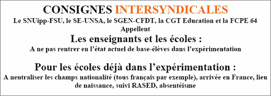Pour Sud Education, le message délivré aux directeurs d’école est simple : « L’utilisation de cette base élèves pourrait s’avérer dangereuse et porter gravement atteinte aux libertés individuelles de chacun(e). C’est pourquoi les syndicats signataires appellent les collègues directeurs et directrices à ne pas entrer dans l’expérimentation et, dans le cas d’une généralisation à la rentrée 2007, à tout mettre en œuvre pour que des informations sensibles ne figurent pas dans ce fichier. »