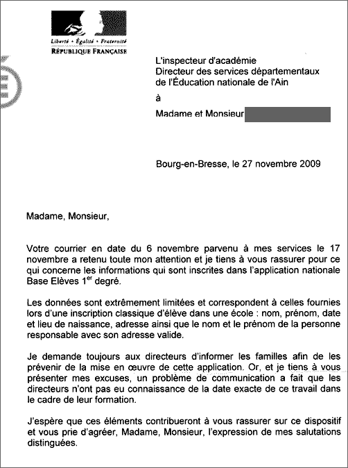 Nous reproduisons un échange de correspondance avec l’Inspection académique de l’Ain, concernant les données personnelles entrées dans le système Base élèves premier degré, tel que nous l’a fait parvenir un parent d’élève. Un échange révélateur de la légèreté avec laquelle les droits des parents et des enfants sont pris en compte.