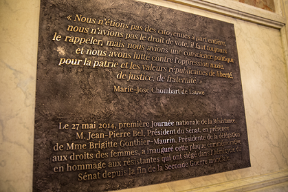 Il y a six ans, le 27 mai 2014, le Sénat, à l’initiative de la délégation, célébrait la mémoire de ces « combattantes de l’ombre » et inaugurait une plaque en hommage aux sénatrices issues de la Résistance. « Nous n’étions pas des citoyennes à part entière, nous n’avions pas le droit de vote, il faut toujours le rappeler, mais nous avions une conscience politique et nous avons lutté contre l’oppression nazie, pour la patrie et les valeurs républicaines de liberté, de justice, de fraternité » : cette phrase de Marie-José CHOMBART de LAUWE, présidente de la Fondation pour la mémoire de la déportation et survivante de Ravensbrück, gravée sur la plaque installée à l’entrée de l’hémicycle, rappelle le sacrifice de femmes qui ont risqué leur vie pour leur pays alors qu’elles n’avaient pas les mêmes droits que les hommes." [2]