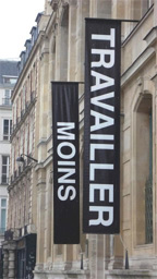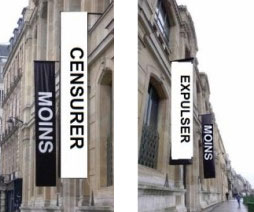 Les quatre bannières de l’artiste chinoise Ko Siu Lan, détournant le slogan du candidat Nicolas Sarkozy à la présidentielle de 2007, "Travailler plus pour gagner plus", dans un premier temps installées sur la façade de l’Ecole des beaux-arts de Paris, dans le cadre d’une exposition, puis démontées par l’école, ont été raccrochées, samedi 13 février, sur ordre du ministre de la culture, Frédéric Mitterrand.