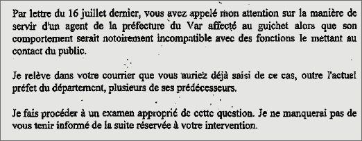 Depuis plusieurs années des personnes se plaignent de l’accueil qui leur est réservé de la part d’un agent du guichet n° 10 du bureau des étrangers de la préfecture de Toulon. Bruno Maranzana, conseiller général du Var, ayant été à plusieurs reprises témoin d’un comportement incompatible avec des fonctions d’accueil du public, a d’abord tenté de sensibiliser plusieurs préfets successifs. Ses démarches étant restées sans effet, il a saisi Madame Alliot-Marie, Ministre de l’Intérieur, qui lui a répondu le 2 août dernier qu’elle faisait procéder à un examen approprié de cette question [1].