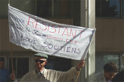 Ces Résistants de 44 nous regardent, se demandant jusqu’où nous allons accepter l’inacceptable. Ils peuvent être rassurés. La Résistance en 2011 a déjà bien commencé et elle se développe. L’ANACR n’a cessé et ne cesse de rappeler les valeurs de la Résistance et l’importance du programme du CNR. Les résistants, malgré leur âge et leur fatigue continuent de témoigner sans relâche dans les lycées et collèges, décrivant la Résistance, ses valeurs, ses combats. Au cours des manifestations de cet automne contre la loi sur les Roms et celle de la réforme des retraites, ses membres à Draguignan comme à Toulon ont distribué des tracts expliquant notre refus de ces lois. Armand Conan, tenant un écriteau sur lequel était écrit “Moi, résistant, 90 ans, 34 ans de retraite=CNR ; Je vous soutiens” a été déclaré grand vainqueur à l’applaudimètre par Var Matin.