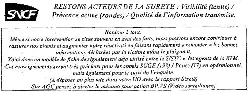 Intitulé « Restons acteur de la sûreté », le document présenté comme devant être rempli par « la victime ou le plaignant », est censé être joint au rapport « Sûreté » que rédige le contrôleur en cas d’incident à bord de sa rame.