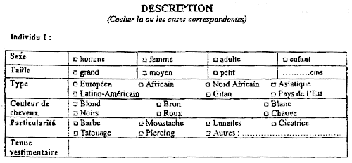 La victime est invitée, pardon, doit « impérativement » donner son identité, son téléphone. Elle doit aussi préciser la nature et le lieu des faits puis procéder au verso à une « description du ou des auteurs. » Parmi les cases à cocher proposées, figurent la « taille », le « sexe » mais paradoxalement rien sur la fourchette d’âge de l’individu puisque le choix n’est proposé qu’entre « adulte » et « enfant ». Par contre là où le document s’enrichit c’est dans sa rubrique « Type » à large palette exotique puisqu’il est proposé à la victime d’identifier son agresseur parmi sept faciès géographico-ethniques : « Européen », « Africain », « Nord Africain », « Asiatique », « Latino-Américain », « Gitan » et « Pays l’Est ».