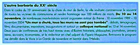 Au programme : pose d’une plaque à la mémoire des « victimes du totalitarisme » [2], une exposition sur le thème : « Communisme, l’autre barbarie du XXe siècle » ... pour terminer par une messe.