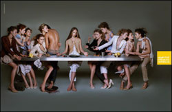 Dans la publicité, les apôtres comme le personnage de Jésus sont des femmes habillées des vêtements de la marque, sur fond gris perle. Un seul homme apparaît, torse nu et de dos, habillé d’un jean et entouré des bras de l’une des "apôtres".