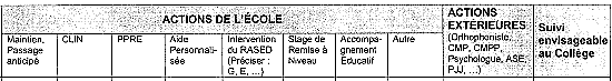 - Parmi les « actions extérieures » on trouve : « orthophoniste », « ASE » (Aide sociale à l’enfance : donnée qui peut là aussi renseigner sur la situation sociale de la famille entière, « psychologue », CMPP (pour savoir si l’enfant est suivi par un Centre médico psycho-pédagogique),