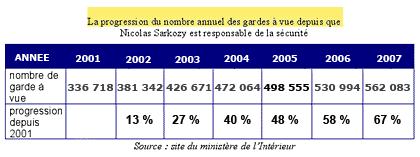 Le nombre des gardes à vue a considérablement augmenté depuis que Nicolas Sarkozy a accédé au ministère de l’Intérieur en 2002, passant de 336 000 en 2001 à 560 0000 en 2007, une progression de 67 % alors que la délinquance est supposée avoir baissé. Ci-dessous un tableau repris du blog de Dominique Barella :