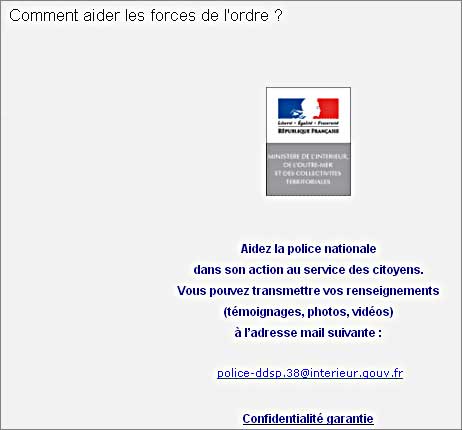 police-ddsp@interieur.gouv.fr pour transmettre tout « témoignage, photographie et vidéo », la « confidentialité est garantie » : celui que l’on arrêtera ne saura jamais quel est le « bon Français » qui l’a dénoncé. Selon le Syndicat des commissaires de la police nationale, « c’est une façon pour les habitants de signaler à la police, de manière feutrée, des faits de délinquance qui les touchent ». En bon Français, l’amateur d’anonymat « feutré » porte un nom : l’indic.Voici donc la version « Internet » de l’appel à la délation, « devoir républicain », selon l’inimitable Frédéric Lefèvre, dont la République a d’étranges accents. Mais le directeur