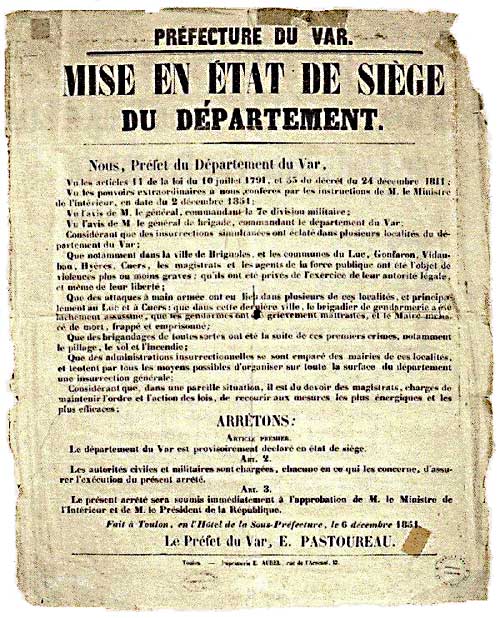Le 2 décembre 1851, Louis Napoléon Bonaparte, qui avait été élu président de la République en 1848, exécutait un coup d’État pour se maintenir au pouvoir et rétablir l’Empire. Dans une vingtaine de départements, notamment les Basses Alpes (aujourd’hui Alpes de Haute Provence), le Var et le Vaucluse, la protestation républicaine prit la forme d’une insurrection populaire "pour le Droit et la Légalité républicaine".