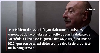 28-09-2023 : "Après le nettoyage ethnique entrepris par Ilham Aliev au Haut-Karabakh au mépris de toute considération humaine ou historique, les regards se tournent vers son autre objectif. Le président de l’Azerbaïdjan claironne depuis des années, et de façon obsessionnelle depuis la défaite de l’Arménie à l’issue de la guerre des 44 jours, à l’automne 2020, que son pays est détenteur de droits de propriété sur le Zanguezour."