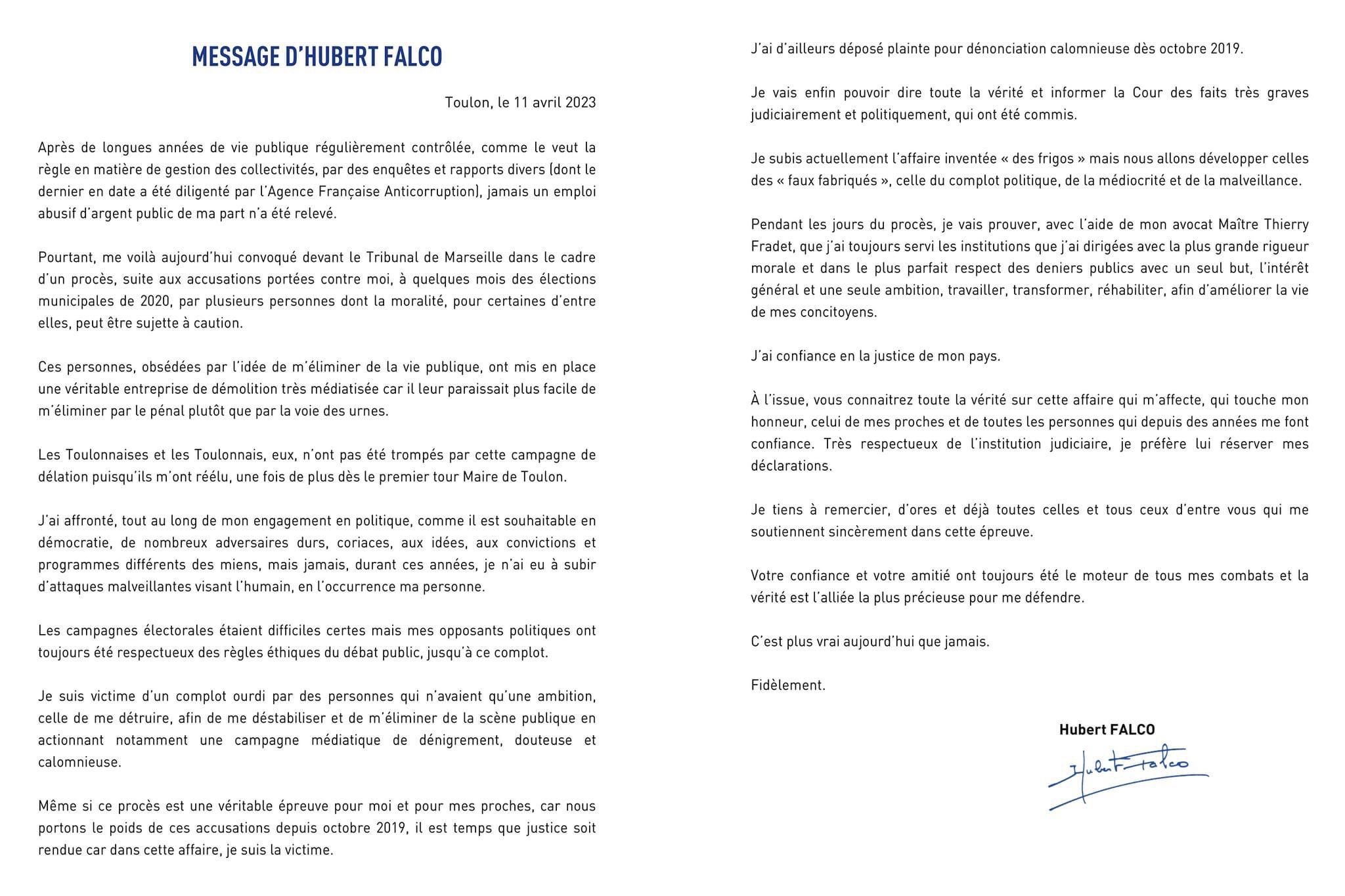 Message d’Hubert Falco le 11 avril 2023