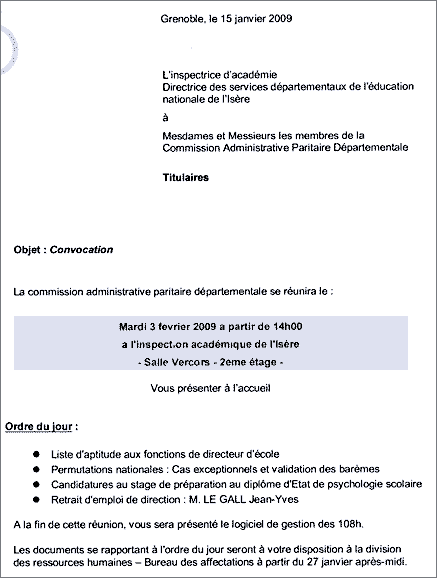 Mardi 3 février 2009, la commission administrative paritaire (CAPD) de l’Isère, présidée par l’inspectrice d’académie, se prononcera sur le retrait de la fonction de direction d’un directeur d’école. Jean-Yves Le Gall a signé avec 171 autres directeurs un appel à la résistance citoyenne contre le fichage des enfants, et il refuse d’utiliser l’application Base élèves.