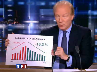 Jeudi 20 janvier 2011, après sa longue conférence de presse annonçant la « baisse de la délinquance » pour la huitième année consécutive en 2010, le ministre de l’Intérieur Brice Hortefeux est intervenu dans le journal de 20 heures de TF1. Après deux minutes de présentation des chiffres déjà annoncés le matin, Hortefeux sort une pancarte :