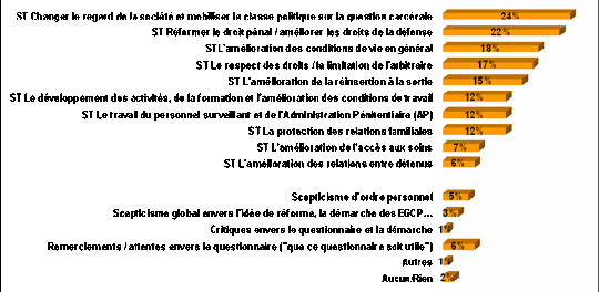 En fin de questionnaire, deux questions appelaient les répondants à un commentaire libre, la première sur les aspects jugés les plus inacceptables des conditions de détention, la seconde sur ce qu’ils attendaient d’une réforme des prisons.
