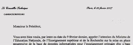 Vous avez bien voulu, par lettre en date du 9 février dernier, appeler l’attention du Ministre de l’Education Nationale, de l’Enseignement supérieur et de la Recherche sur la mise en place progressive de la base de données informatisées pour l’enseignement primaire dite « base élèves ».