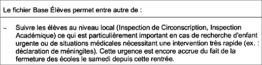 Avec la mise en place de Base élèves et l’attribution d’un identifiant national qui permettra de suivre chaque “enfant” pendant 35 ans dans la Base Nationale des Identifiants Elèves, la BNIE [5], l’Education nationale disposera d’une base de données considérable – à commencer par le domicile, les coordonnées actualisées de la famille et des proches.