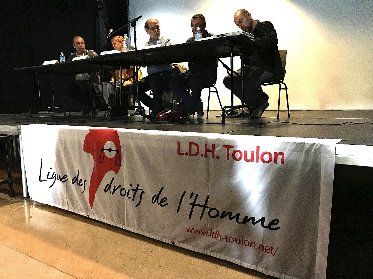 Ci-dessous, photo des intervenants réunis le 28 septembre au Comptoir des Idées, à Toulon pour la soirée ciné-débat organisée par la section LDH Toulon et au cours de laquelle le film "Contre-pouvoirs" de Malek Bensmaïl a été diffusé.