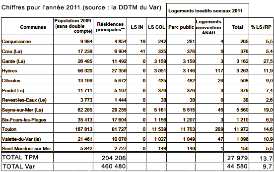 En 2012, 1 570 logements sociaux ont été construits dans le Var. Mais, pour arriver à 25 % de logements sociaux locatifs à l’horizon 2025, conformément aux modifications récentes de la loi SRU, il faudrait, selon le sous-préfet Boris Barnabeu, en construire 4 000 par an... On est très loin du compte, notamment dans la communauté d’agglomération Toulon-Provence-Méditerranée où ce taux est actuellement de 13.7 %. Il est de 14.6 % pour Toulon — ce qui a entraîné l’inscription de la ville en tête du « tableau de déshonneur » publié en 2011 par la Fondation Abbé Pierre.