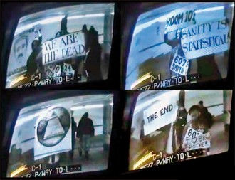 A l’écran, un moniteur vidéo. Celui d’une caméra de surveillance placée au coin de la 14e Rue et de la 7e Avenue dans une station de métro new-yorkaise. Les voyageurs défilent, pressés de rentrer chez eux ou d’aller travailler. Tout d’un coup surgissent trois personnes qui portent un carton frappé d’un numéro. Un quatrième type s’avance vers la caméra – masque de squelette sur le visage – et exhibe un grand carton sur lequel on peut lire : « Big Brother is watching you. » Bienvenue dans une pièce de théâtre un peu particulière, adaptation express et cheap de 1984, de George Orwell. Une version de dix minutes (!) écrite pour pouvoir être jouée devant l’une des milliers de caméras qui contrôlent l’espace public new-yorkais.