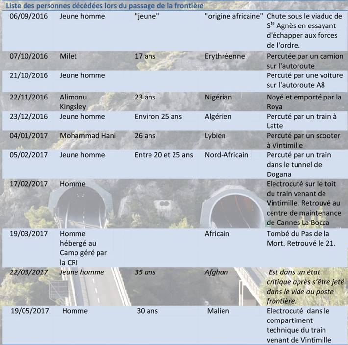 "Un migrant de sexe masculin âgé de 30 ans trouvé mort vendredi soir en gare de Cannes La Bocca dans le compartiment technique d’un train en provenance de Vintimille (Italie). (...) Il s’agit de la deuxième mort d’un migrant en gare de Cannes La Bocca depuis le début de l’année. Le corps carbonisé méconnaissable d’un migrant avait été trouvé le 17 février sur le toit d’un train en provenance de Vintimille. Dimanche dernier, un autre migrant avait été trouvé, gravement brûlé aux jambes, sur le toit d’un TER en provenance de Vintimille (...) Ce nouveau décès dramatique porte à douze, selon les ONG intervenant sur place, le nombre de morts de migrants enregistrés dans la région depuis 2016. Les interpellations à la frontière franco-italienne sont en forte hausse depuis le début de l’année et ont presque triplé par rapport au début 2016, selon les derniers chiffres de la préfecture." [1] [2]