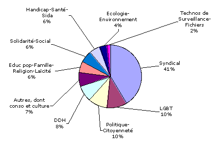 Elle montre la très forte mobilisation des associations LGBT (10 % des signatures de collectifs), ainsi que celles de malades, notamment du sida, et de handicapés (6 %). Elle a été forte également dans le champ politique, massive dans le champ syndical (41 %, toutes confédérations, branches et sections confondues), bien au-delà des seuls responsables syndicaux faisant partie des « personnalités » susceptibles d’être fichées. Les 33 % restants se répartissent assez équitablement entre organisations agissant dans le champ des droits de l’homme, du social et de la solidarité, de la famille, de la jeunesse et de l’éducation populaire, de la religion et de la laïcité, de l’écologie ou l’environnement ainsi qu’un agrégat allant de la consommation à la culture, en passant par la Fédération française des motards en colère. On notera enfin que seulement 2 % des organisations signataires travaillent spécifiquement sur la question des techniques de surveillance et de fichage, une tendance tout à fait inverse de ce qui est généralement observé avec les pétitions contre les fichiers.