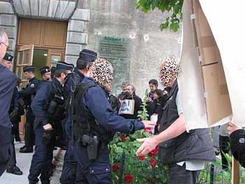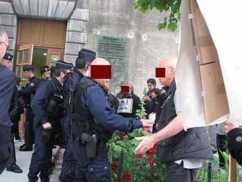 Une fois les directeurs partis, les policiers sont restés en rang serrés devant l’entrée de l’IA (l’Inspection académique) face à nous. Le Secrétaire général de l’IA se promenait au milieu des policiers, un petit sourire aux lèvres. Il faut dire qu’avant l’intervention de la police, il essayait de convaincre les directeurs que le combat contre Base élèves était perdu d’avance !