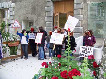 Mardi 20 mai 2008, une formation à Base élèves était organisée à l’Inspection académique (IA) de Grenoble à l’intention des directeurs d’école. Des parents opposés à la mise en place de ce fichage des enfants s’étaient donnés rendez-vous pour essayer de bloquer pacifiquement l’accès à l’IA ; une quinzaine d’entre eux (en majorité des femmes) ont été malmenés par une vingtaine de représentants des forces de l’ordre équipés de matraques, flashballs et gaz lacrymogènes ... Les armes de dissuasion n’ont pas été utilisées mais devant tant de violence affichée les directeurs d’école ont quitté l’IA.