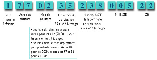 Le numéro d’inscription au répertoire (NIR) national d’identification des personnes physiques est créé à partir des états civils des mairies, affectant ainsi à chaque personne née en France un numéro d’identification de 13 chiffres. La position des chiffres a une signification. Ainsi, le numéro 1 77 02 35 238 005 concerne un homme né en février 1977 à Rennes (code 238), dans le département d’Ille et Vilaine et qui était la cinquième naissance dans cette commune ce mois-là. A ces 13 chiffres, s’ajoute une clé de contrôle de deux chiffres [7].