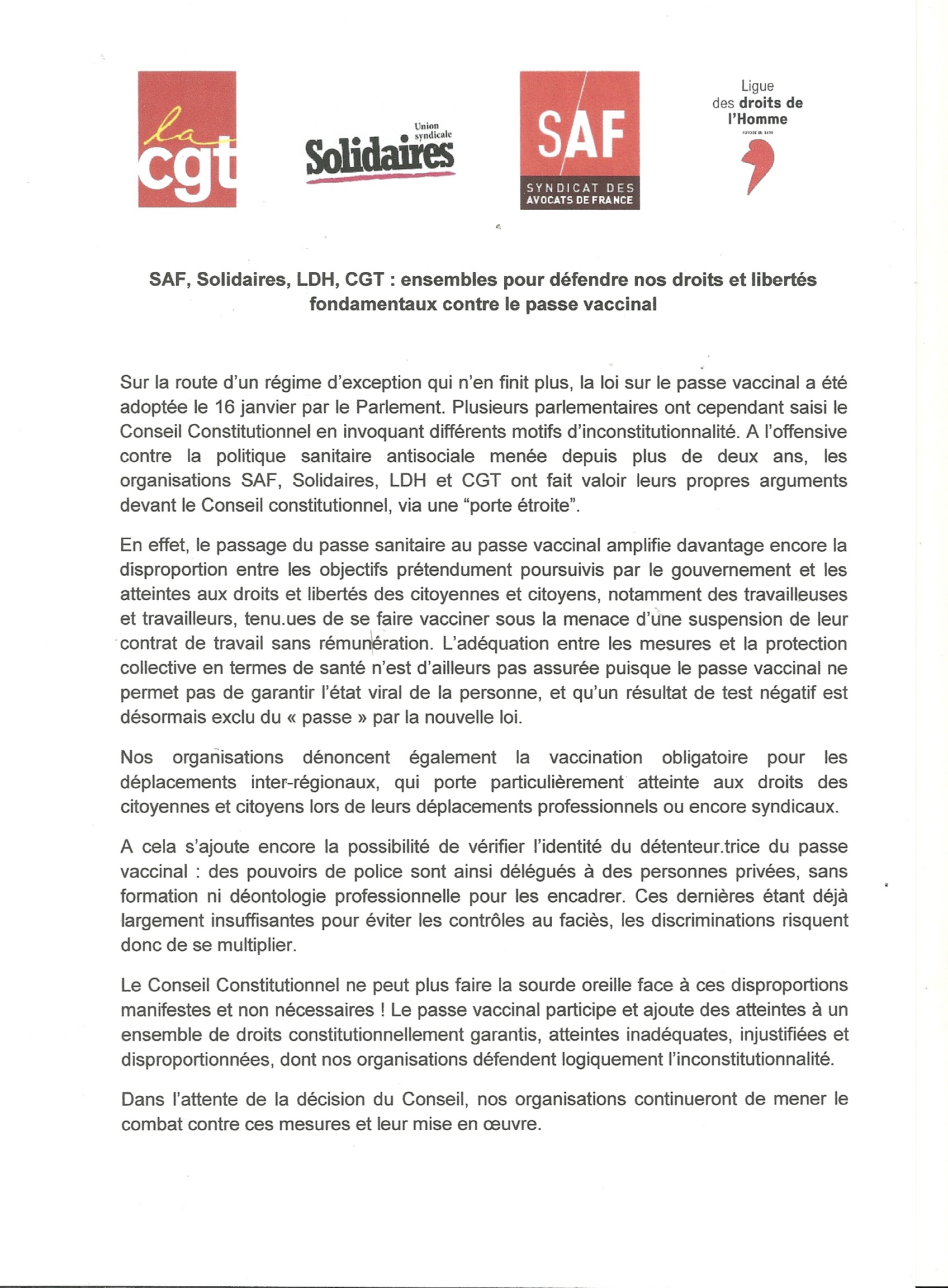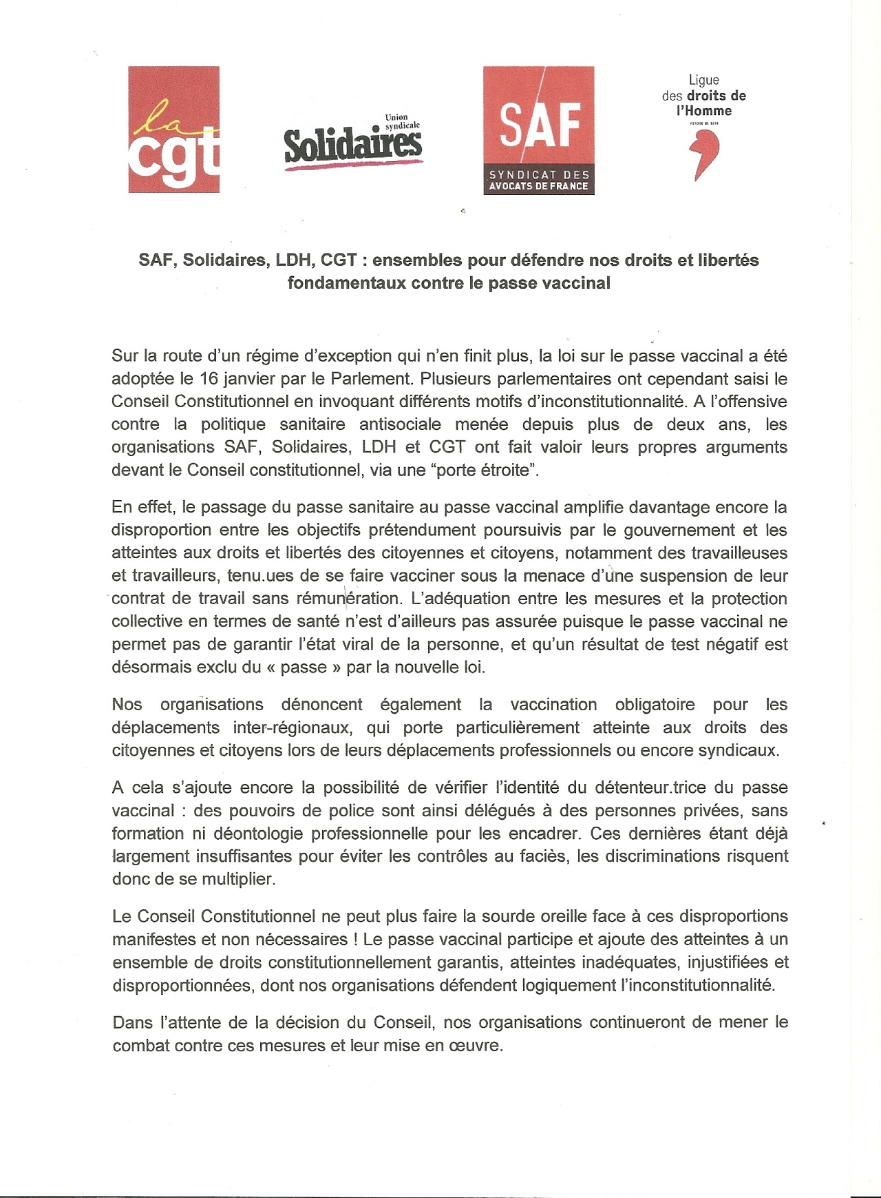Le 16 janvier 2022, les parlementaires ont voté le "passe vaccinal". Plusieurs organisations ont saisi le Conseil Constitutionnel.