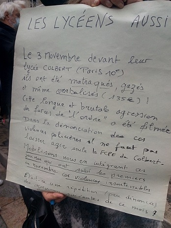 3 nov. 2020 : jour de rentrée, les élèves de plusieurs lycées parisiens avaient dénoncé le non-respect des consignes sanitaires et un appel au blocage avait été lancé pour obtenir « la fermeture des lycées et écoles tant que la sécurité ne sera pas assurée ». (...) Ils ont été repoussés violemment. Certains ont reçu des coups de matraque et ont été gazés », raconte un lycéen en classe de seconde qui a assisté à la scène mais dit ne pas avoir participé au blocus." [2]