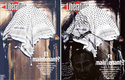 A gauche, la une originale de Libération du 12 novembre 2004, jour de l’enterrement du leader palestinien Yasser Arafat. A droite, le détournement d’Ernest Pignon-Ernest, mettant en scène Marwan Barghouti, un activiste palestinien emprisonné en Israël, sous le célèbre keffieh. DR