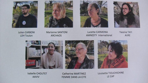 Du 2 au 5 mars, la LDH Toulon a accueilli les hommes et les femmes qui contribuent au combat pour les droits des femmes sur notre territoire. Leurs témoignages ont été enregistrés et vous pouvez voir et entendre celles et ceux qui, quoditiennement, apportent leur expertise pour aider, accompagner, soutenir, les femmes et les enfants qui rencontrent des difficultés. Plusieurs autres structures et associations n’ont pas pu, pour des raisons liées à leurs obligations, participer à cet hommage mais nous savons ce qu’elles font, jour après jour, pour les droits des femmes. Qu’ils, qu’elles soient, tous et toutes, sincèrement remercié-e-s.