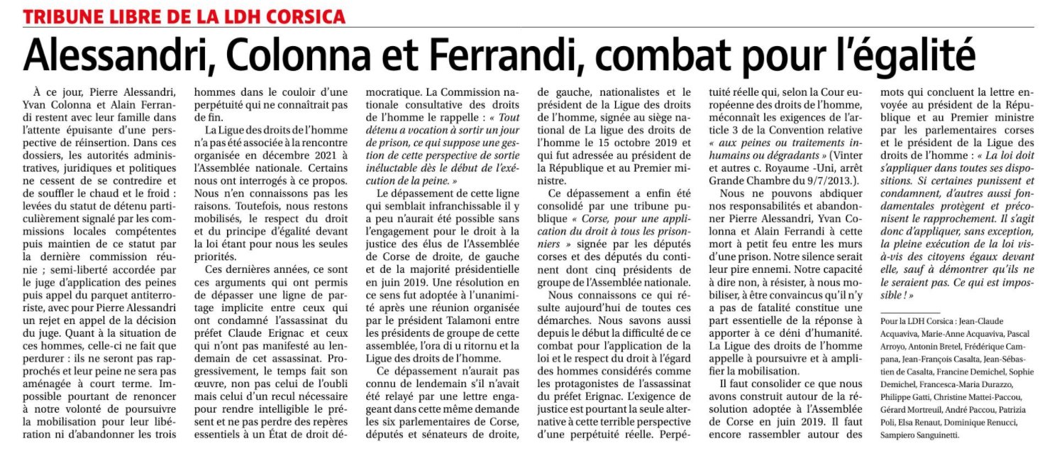 LDH Corsica : "Le respect du droit et du principe d’égalité devant la loi est pour nous la seule priorité."
