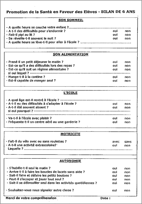 L’article L541-1 du code de l’Education prévoit que chaque enfant soit soumis à une visite médicale, au cours de sa sixième année. L’Inspection Académique de Loire Atlantique connaît la loi, elle adresse donc aux parents des enfants de 6 ans (Grande Section) une fiche de renseignements, en leur demandant de répondre à toute une série de questions très précises concernant leurs enfants, en vue de la visite médicale réglementaire.