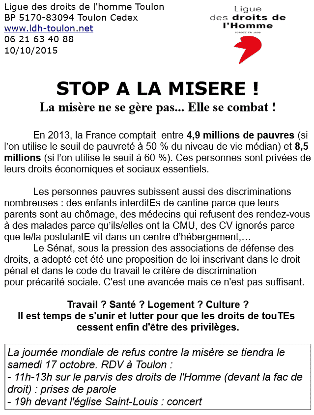 La section de Toulon de la LDH participe avec d’autres associations locales à la Journée mondiale de refus contre la misère le 17 octobre 2015. Elle rappelle que ce jour est égalemnt l’anniversaire du massacre de 1961 à Paris.