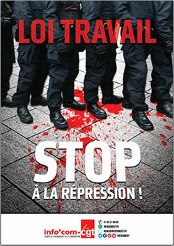 Une mare de sang et des policiers en rang. La CGT a publié, dimanche 1er mai, une nouvelle affiche afin de dénoncer les violences policières et la répression faite par les forces de l’ordre lors des manifestations contre la loi Travail. Cette affiche est dans la continuité d’une autre publiée en avril dernier. Sur des pavés en sang, une matraque était posée par terre avec un insigne de policier. Le message suivant y était écrit : "La police doit protéger les citoyens et non les frapper ! Stop à la violence". Dans une lettre ouverte adressée à Philippe Martinez, Bernard Cazeneuve estimait que l’affiche mettait "gravement en cause la police nationale".