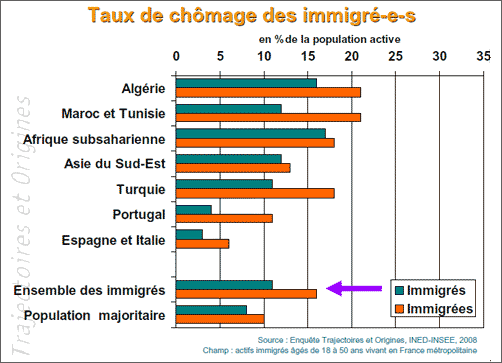 L’enquête nous apprend que le taux de chômage de l’ensemble des hommes immigrés est de 11%, contre 8% pour la population majoritaire homme, mais surtout que la situation est pire pour les hommes enfants d’immigrés que pour les immigrés eux-mêmes, avec 13% de taux de chômage.