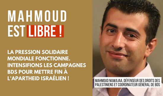 17 août 2020 — Aujourd’hui, le défenseur palestinien des droits de l’homme et coordinateur de BDS, Mahmoud Nawajaa, a été libéré par un tribunal militaire israélien, après 19 jours de détention illégale sans inculpation. Depuis son arrestation le 30 juillet dernier, le Shin Bet de la sécurité intérieure israélienne n’a présenté aucune accusation formelle contre lui.