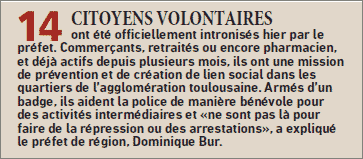 Ci-dessous quelques précisions sur ces différentes étapes d’un processus qui risque de déboucher sur la mise en place de milices armées, puis un petit dossier consacré à l’“intronisation” à Toulouse de 14 nouveaux citoyens volontaires.