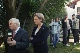 Des jeunes du CEF de Hendaye observent le ministre de la justice et la ministre de la défense répondre aux journalistes le 23 février 2007 (AFP/DANIEL VELEZ)
