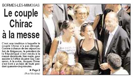 Jacques Chirac et son épouse Bernadette, en visite privée au Fort de Brégançon (Var), ont assisté hier à la messe de Pentecôte célébrée en l’église Saint-Trophyme, à Bormes-les-Mimosas. Le couple présidentiel a été accueilli par un groupe folklorique provençal , jouant du fifre et du tambourin, et a pris un bain de foule devenu habituel . [4]