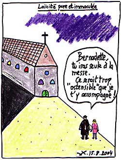 "Déshabiller" la tête de sœur Adalberta et de ses semblables, c’est pourtant ce que prêche le laïc Sarko. Et comme il l’a rappelé voilà peu sous les sifflets au congrès de l’UOIF (Union des Organisations Islamiques de France) à propos du foulard, proscrit sur les cartes d’identité : "Cette obligation est respectée par les religieuses catholiques comme par toutes les femmes vivant en France." Sauf les femmes de président de la République et leurs copines cornettes à piston. [8]