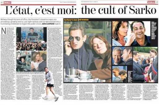 Le quotidien britannique The Independant publie dans son édition du 23 octobre 2009 un article de John Lichfield intitulé « L’état, c’est moi : the cult of Sarko ». En voici le chapeau :